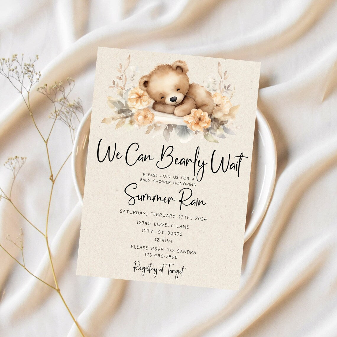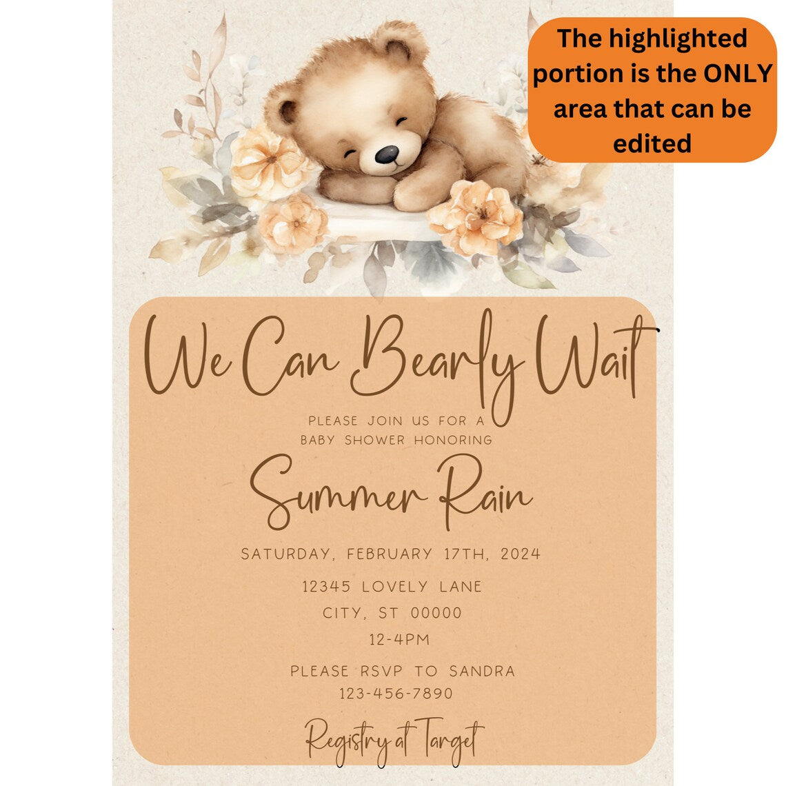 Baby Bear Girl Boho Theme Editable Invitation Template